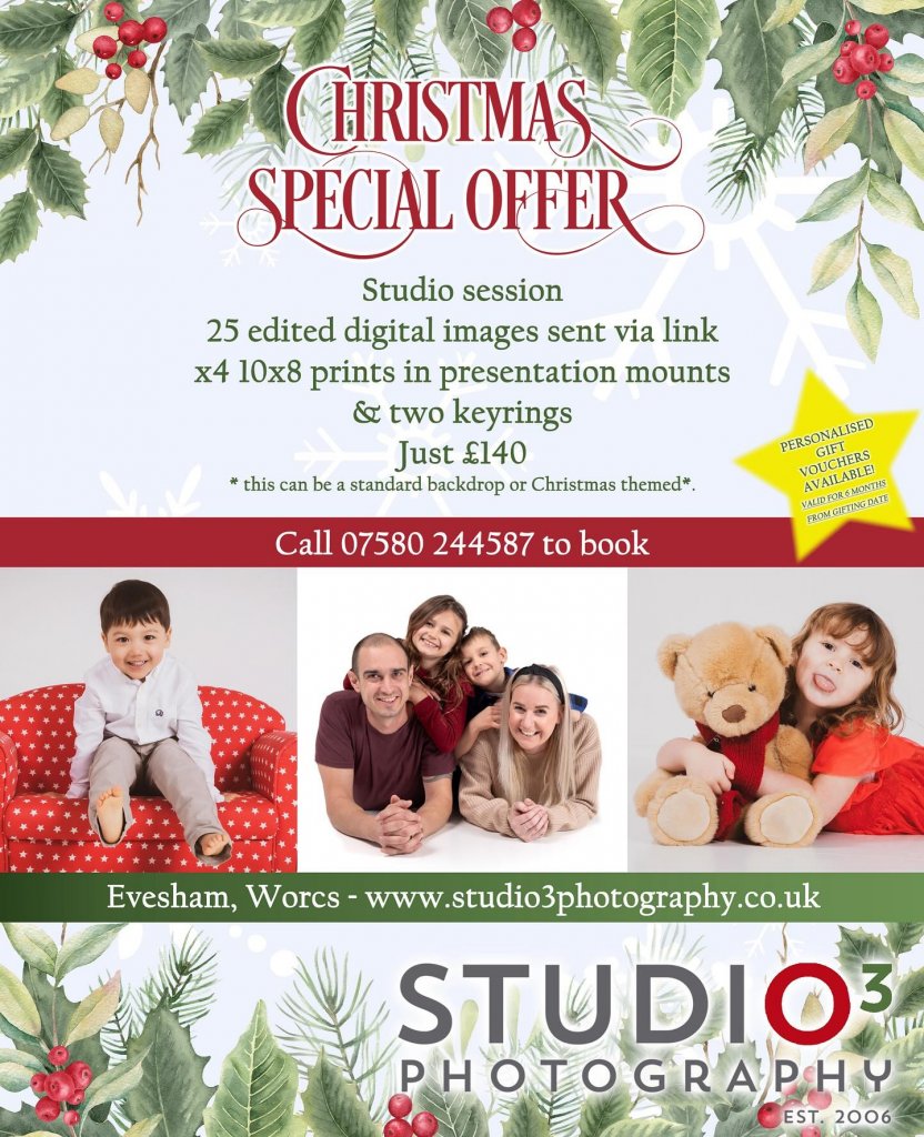 This festive season, Studio3 Photography in Evesham is inviting families, couples, and individuals to capture their most cherished moments with a limited-time Christmas Special Offer. Perfect for creating beautiful keepsakes or thoughtful gifts, the package includes a professional studio session, 25 expertly edited digital images delivered via online link, four 10×8 prints in elegant presentation mounts, and two personalised keyrings — all for just £140.