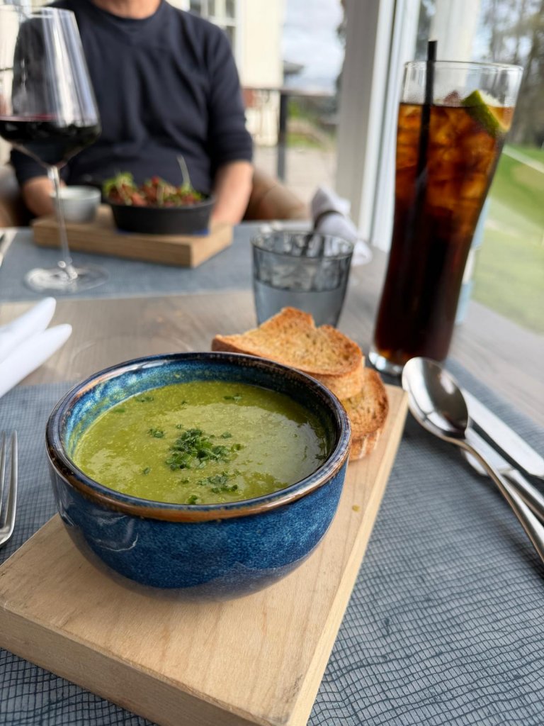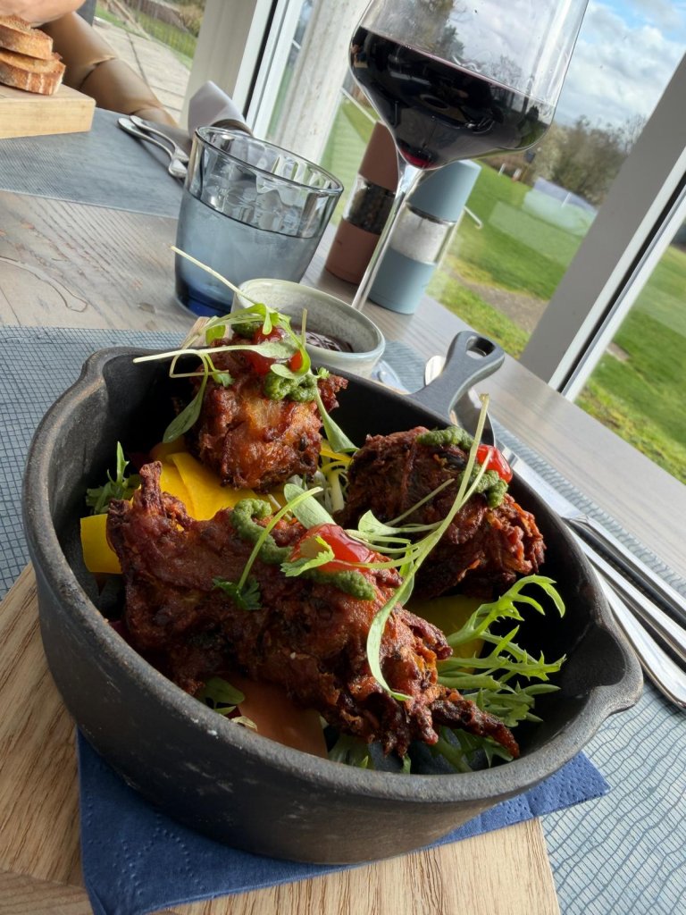 The meal began with a pair of starters that immediately set the tone for what was to come, vibrant, seasonal and full of flavour. The spring greens soup, made with broccoli, spinach, watercress and leek, was wonderfully fresh and nourishing, each ingredient bringing its own gentle depth, lifted beautifully by a slice of herby garlic sourdough that added warmth and richness. Alongside it, the “real” onion bhaji was a standout in its own right, a carefully balanced mix of red and spring onion, chive and leek, crisp on the outside and soft within, served with a perfectly tangy tamarind ketchup that brought everything together. It felt like a true celebration of local produce, thoughtfully prepared and full of character, a genuinely impressive start.