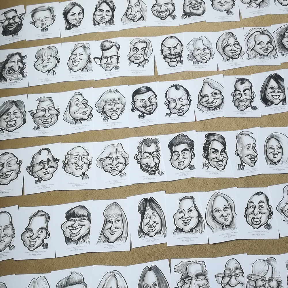 As part of the live service, photos are taken of the subjects holding their caricatures, then emailed after the wedding day. This way, the newly-weds will get to see all the caricatures drawn that they may have missed on the day.