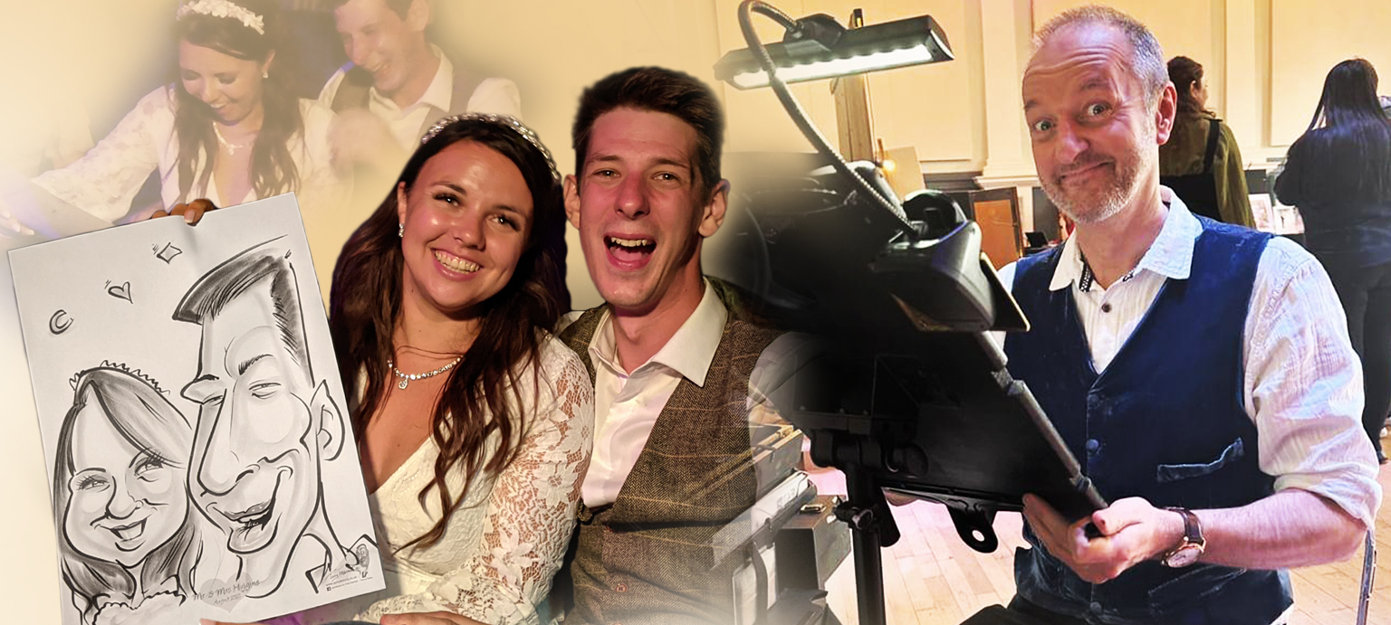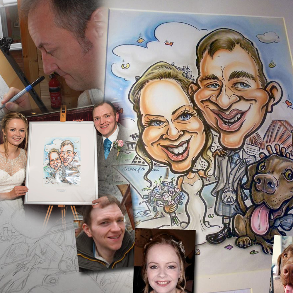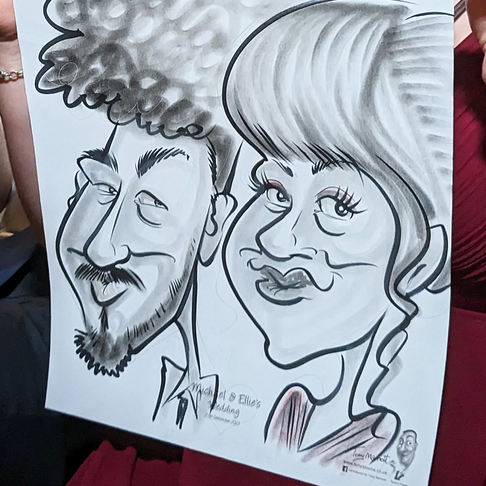 As well as the entertainment package, you can also have a caricature created beforehand! Tony, offers a range of more detailed range caricatures that can also include surrounding scenes, plus in colour too if required. Newly-Wed Keepsakes, Guestboards, Favours, Thank You Gifts, are all offered as extras, but you can also take advantage of the ‘Package deal’ offered, when booking the entertainment service.