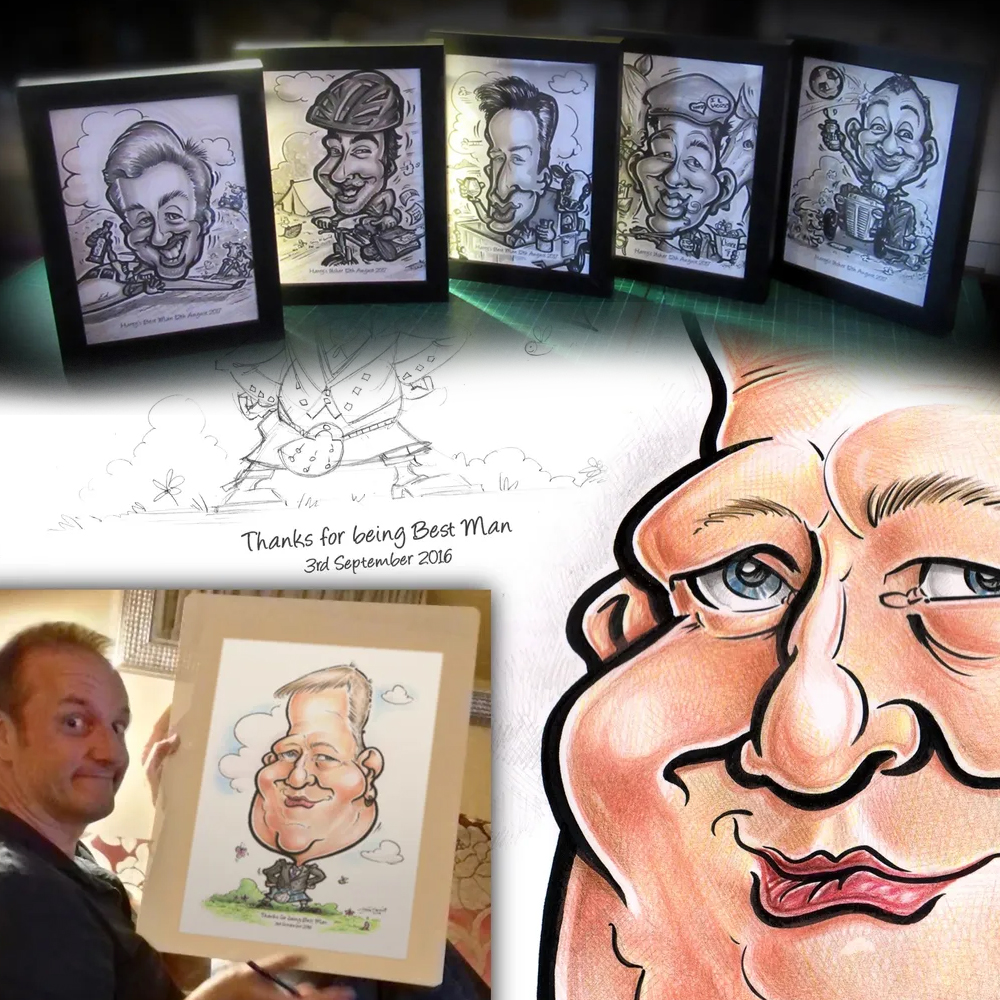 Instead of the usual jewellery or hip-flasks, why not be different and present a truly personalised and fun gift to make them laugh out loud! Everyone knows the traditional content of a best man’s speech, so why not present his ’embarrassing past’ in framed caricature form, in all its glory! Email a few photos, plus a little info on the subject and it will be done. Caricatures also make superb gifts for the ushers, bridesmaids, pageboys, mums and dads and of course… even the groom and bride too, as a wedding gift for them!