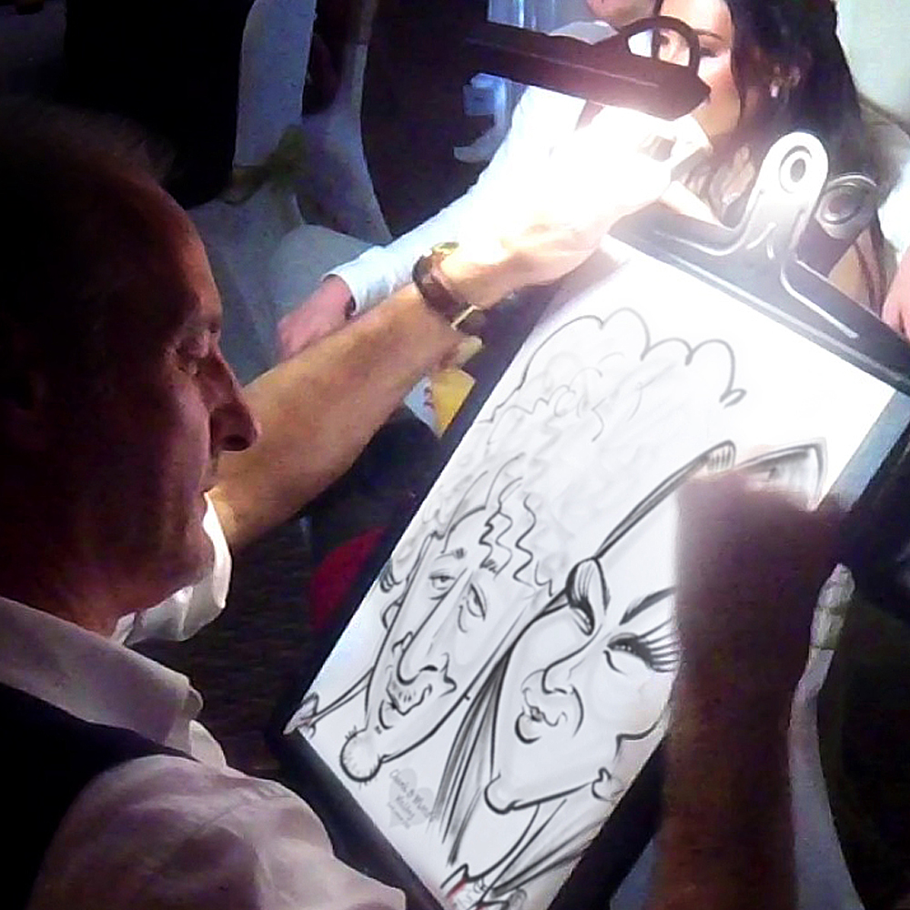 A fabulous way of grabbing all your guests’ attention with some fun and laughter as they begin the celebrations! Each person takes approximately five minutes to be drawn. Guests never forget that moment when you see themselves in stretchy-face caricature form, capturing them with a comical expression! A true, crowd-pleasing spectacle as caricatures emerge and get sillier by the second, erupting in a wave of giggles and screams from the crowd gathered around, with even more laughter from the subjects, as the big reveal is made when the paper is turned. Tony can draw up to four hours, so giving your guests a good chance of having one drawn.