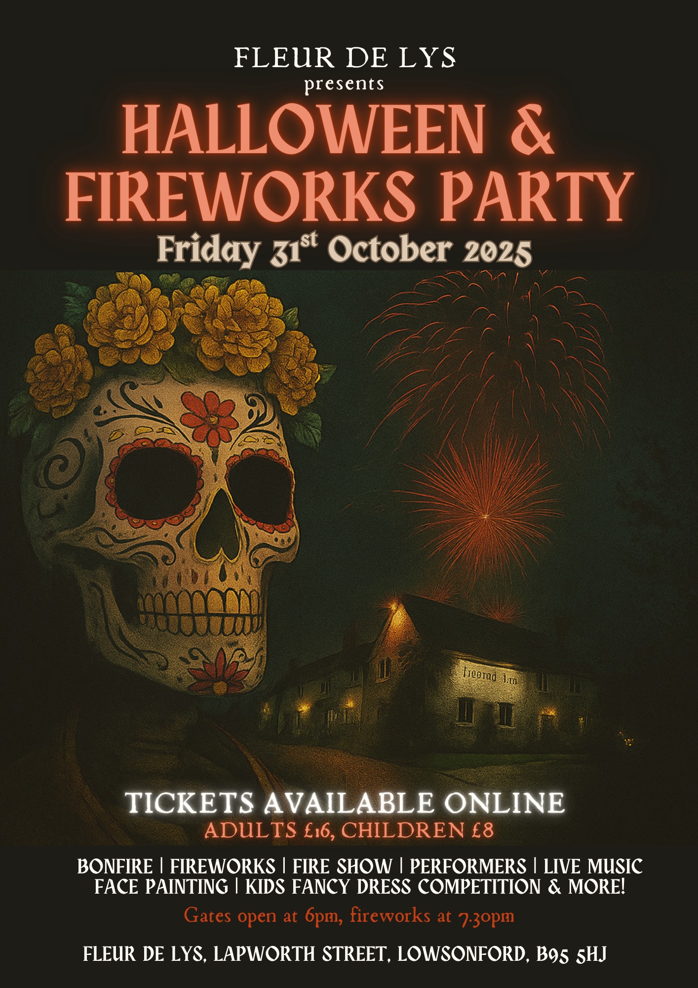 A fireworks spectacle and spooky surprises will be central to a Day of The Dead-themed fun Halloween event at The Fleur de Lys in Lowsonford this month. The pub’s Halloween & Fireworks Party, on October 31st, will feature a host of live family entertainment, from fire shows to music and food, marking the eleventh Bonfire Night event organised at The Fleur by licensees Emma and Nick Woodhouse.