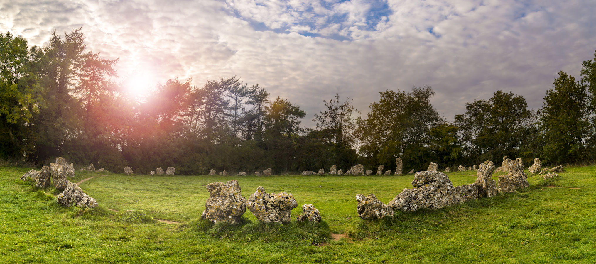The King’s Men is a circle of 72 standing stones, around 30 meters in diameter. The Whispering Knights is a portal dolmen, a prehistoric burial chamber with two standing stones and a capstone. The King Stone is a large, solitary standing stone located about 100 meters from the other two elements.