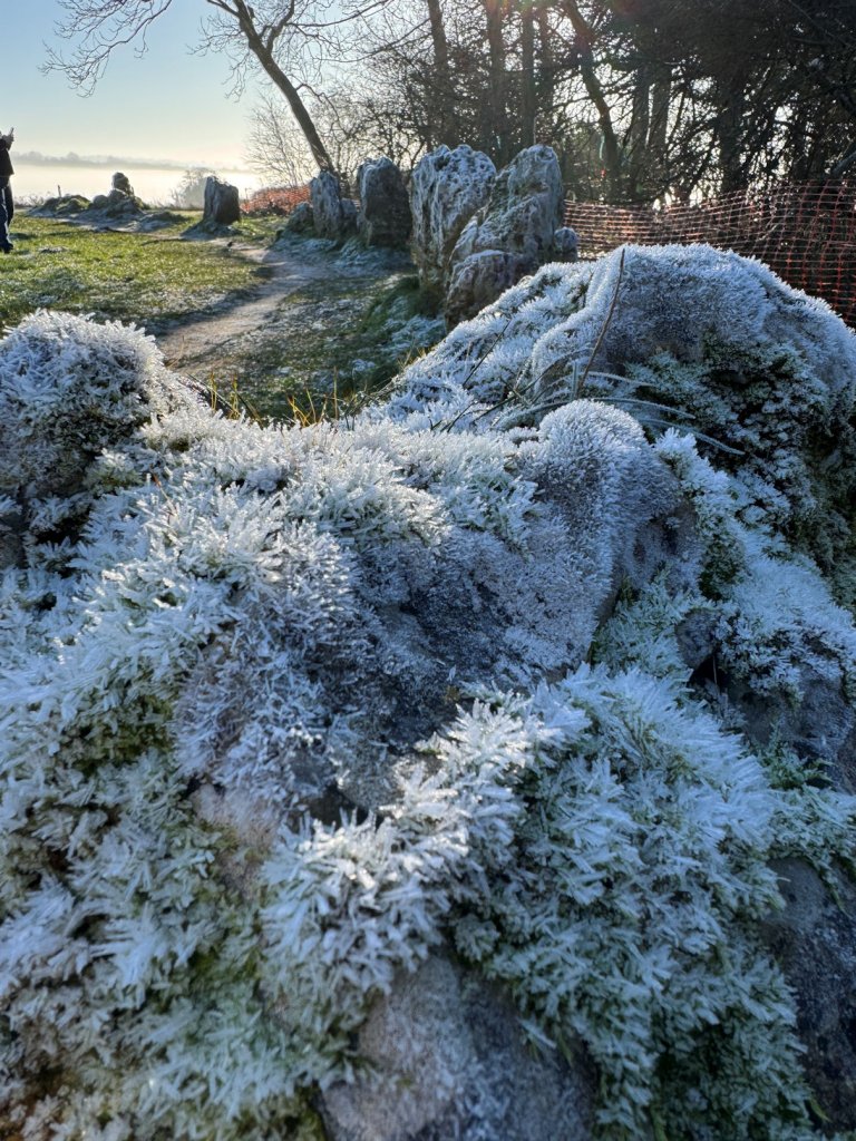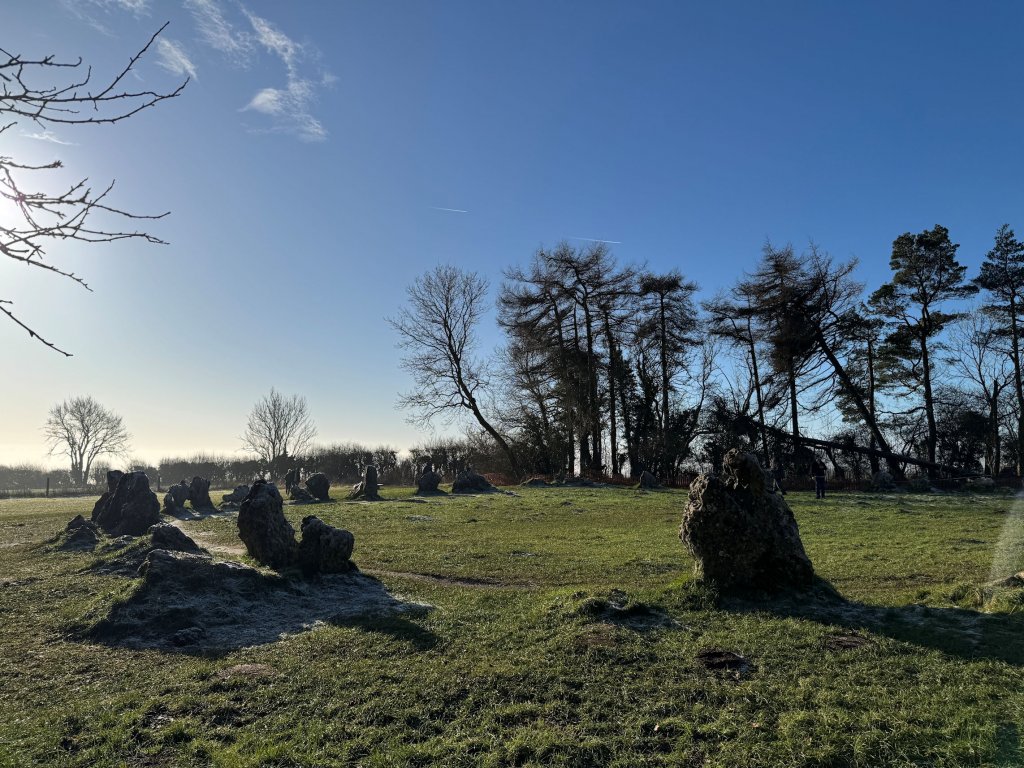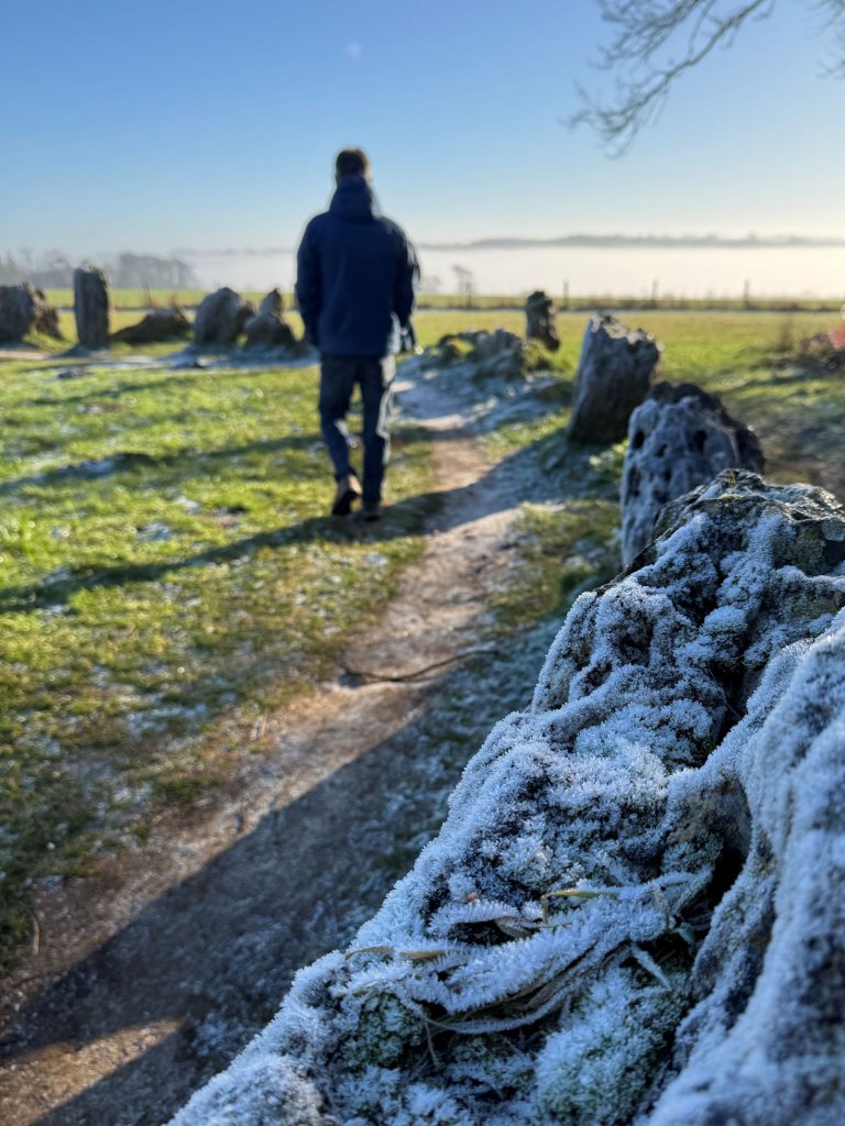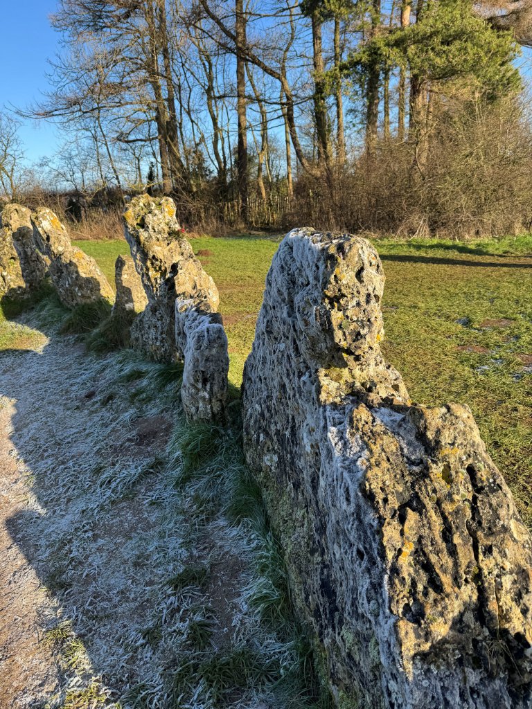 Driving from Moreton-in-Marsh towards Chipping Norton with the beautiful Cotswold countryside covered in a blanket of thick white frost, we parked by the sign to the site of the stones, walked through the gate on the side of the road and were surprised to find the King’s Men stone circle right next to the road. Hidden only by a thin line of trees, they were almost invisible until we were right next to them.