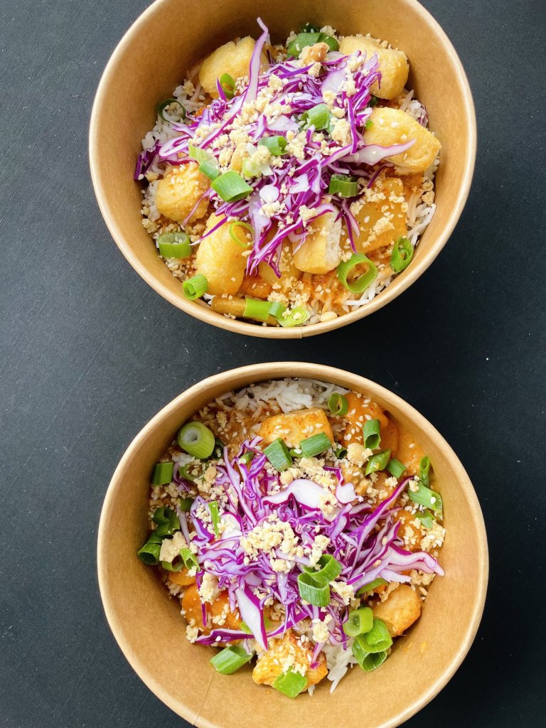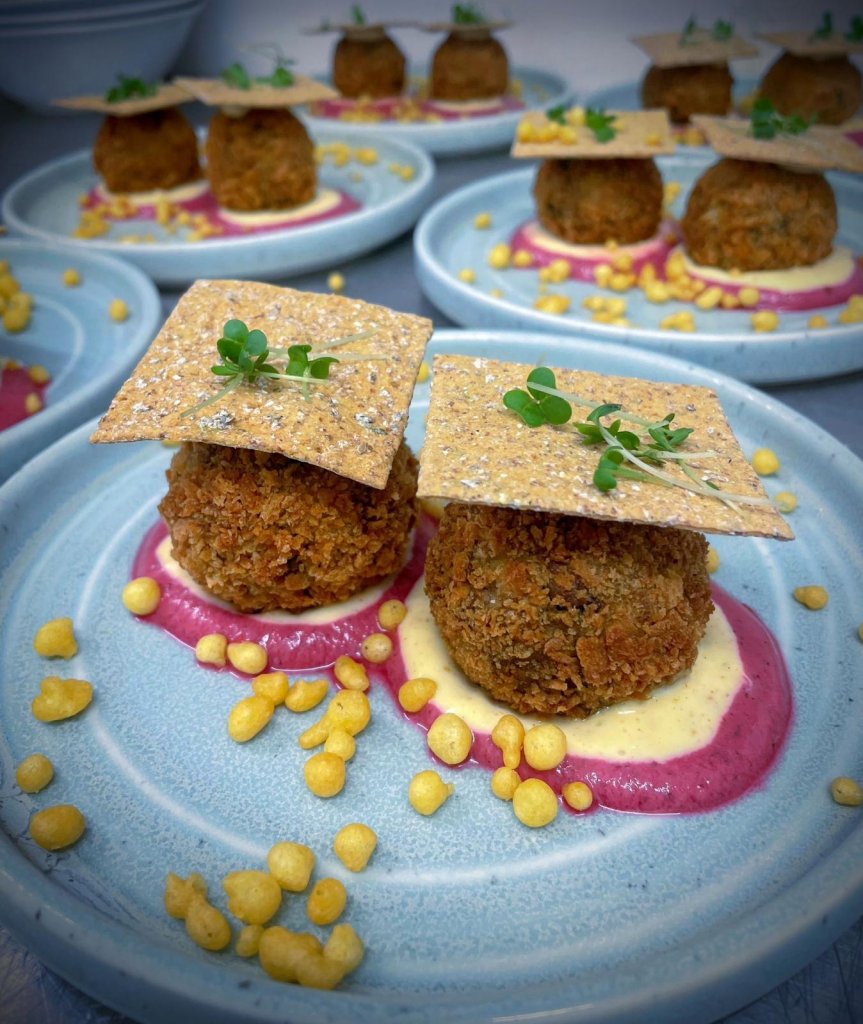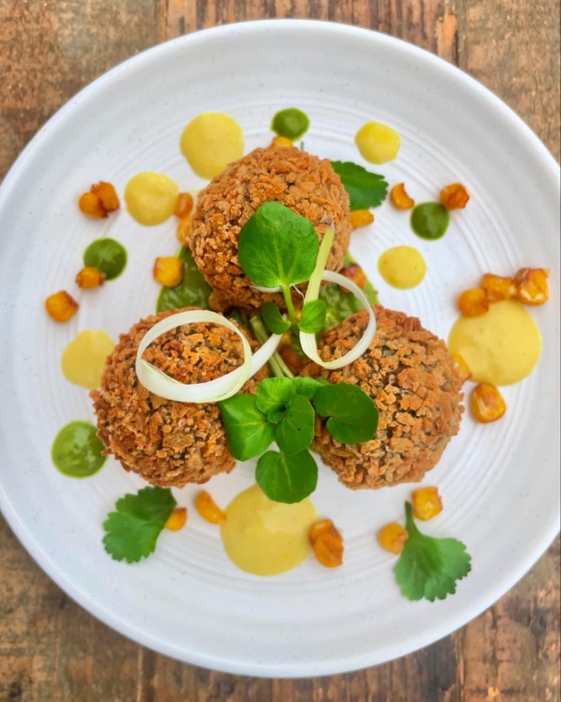 The main course features katsu paratha tacos, filled with katsu-spiced pulled chicken or mushroom, layered with chaat masala, avocado crema and roquito peppers, and complemented by pickled apple and beetroot. Served in flaky Malabar parathas finished with organic brown butter, this dish brings together comfort, richness and vibrant flavour.